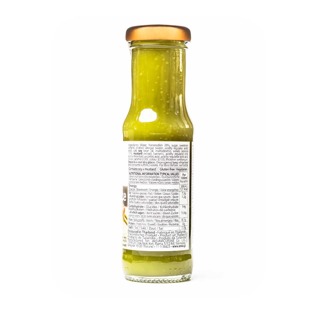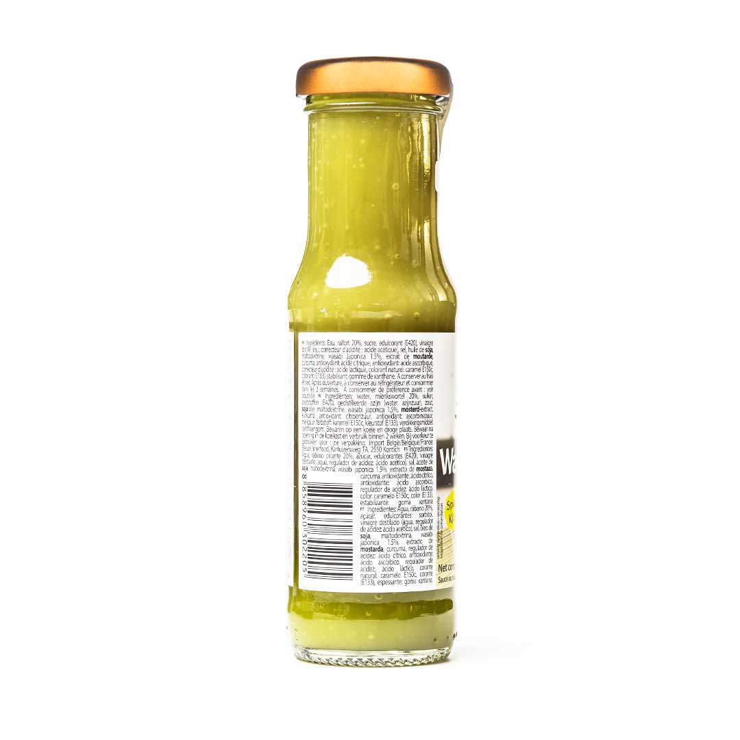 Zutaten: Wasser, Meerrettich 20,00%, Zucker, Süßstoff: Sorbitol, destillierter Essig (Wasser, Säureregulator: Essigsäure), Salz, Sojabohnenöl, Maltodextrin, Wasabi Japonica 1,50%, Senfextrakt, Kurkuma, Säureregulator: Zitronensäure, Antioxidationsmittel: Ascorbinsäure, Säureregulator: Milchsäure, Farbstoff: Karamell E150C, Farbstoff (E133), Verdickungsmittel: Xanthangummi.
